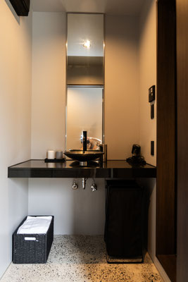 石材/タイル/アイアンといった無機質素材の空間の中でも、なぜか温かみのある仕上がりです。アイアンは職人が1本1本捻って製作した特注品。石材(レッドトラバーチン)は石割を300角にしてNEO-Classicな雰囲気を表現。左官壁も独特な塗り方で間接照明が当たることにより陰影が出て雰囲気抜群です。洗面台/洗面器/天板関係...他、石材をふんだんに使用して高級な仕上がりの中でもいやらしさのないスタイリッシュな空間です。
