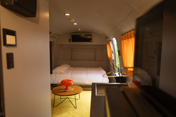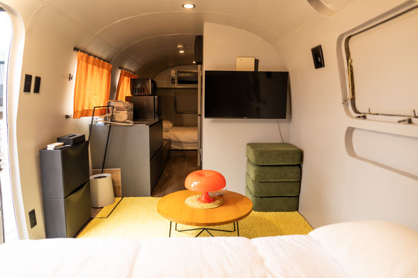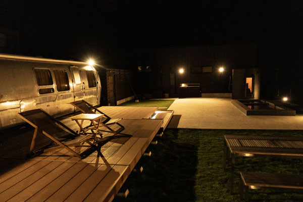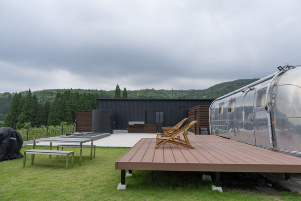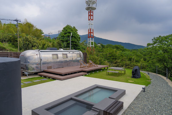 温泉/サウナを各党に配置しエアストリーム(アメリカンビンテージトレーラー)2棟と母屋の3棟からなるグランピング施設をプラン/デザイン