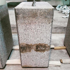 この御影石には、本来含まれる鉄分の酸化・長年の経年付着汚れ・タバコのヤニなどの汚染等20数年の汚れ・シミがありました